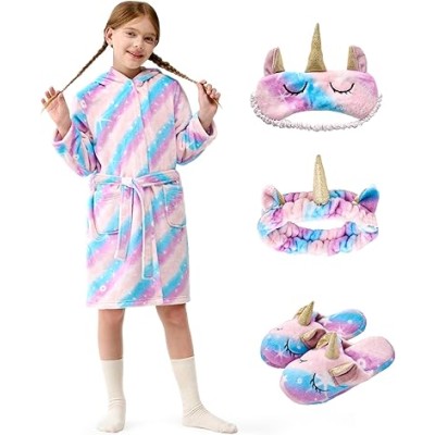Unicorn Kids Robe, Girls Bath Robe with Headband, Slippers, Eye Mask, Girls Christmas Pajamas