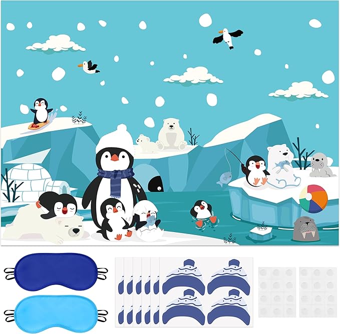 Pin the Hat On the Penguin Party Game Poster with Stickers Fun Winter Polar Arctic Animals Themed Activities Party Decorations